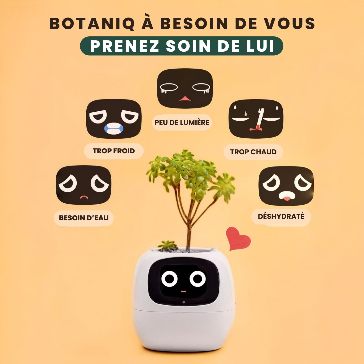 Botaniq n’est pas qu’un pot de plantes : c’est un petit compagnon plein de vie qui apporte douceur et réconfort au quotidien. Avec ses expressions adorables et son attention constante, il veille sur votre plante comme si c’était la sienne et vous fait sentir plus proche de la nature. Une présence apaisante, connectée et chaleureuse, qui trouve naturellement sa place dans votre maison.